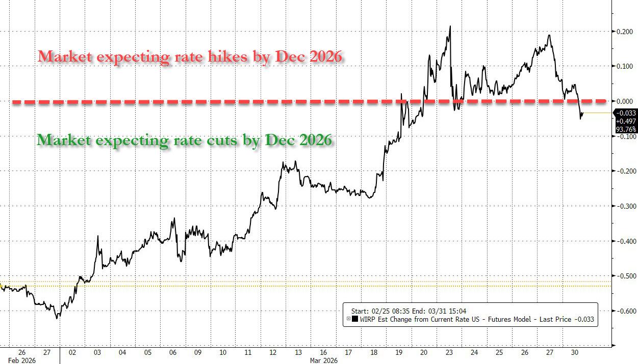 如下图所示,上周初,期货市场定价年底前加息是板上钉钉的事,并直到上周五仍认为此举极有可能发生。然而在周一,情绪发生了巨大转变,以至于交易员一度认为年底前降息的可能性达到20%。
