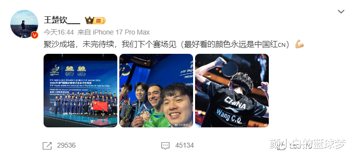 王楚钦也发文:聚沙成塔,未完待续,我们下个赛场见。(最好看的颜色永远是中国红)【王楚钦带着国乒的信念真的很棒】